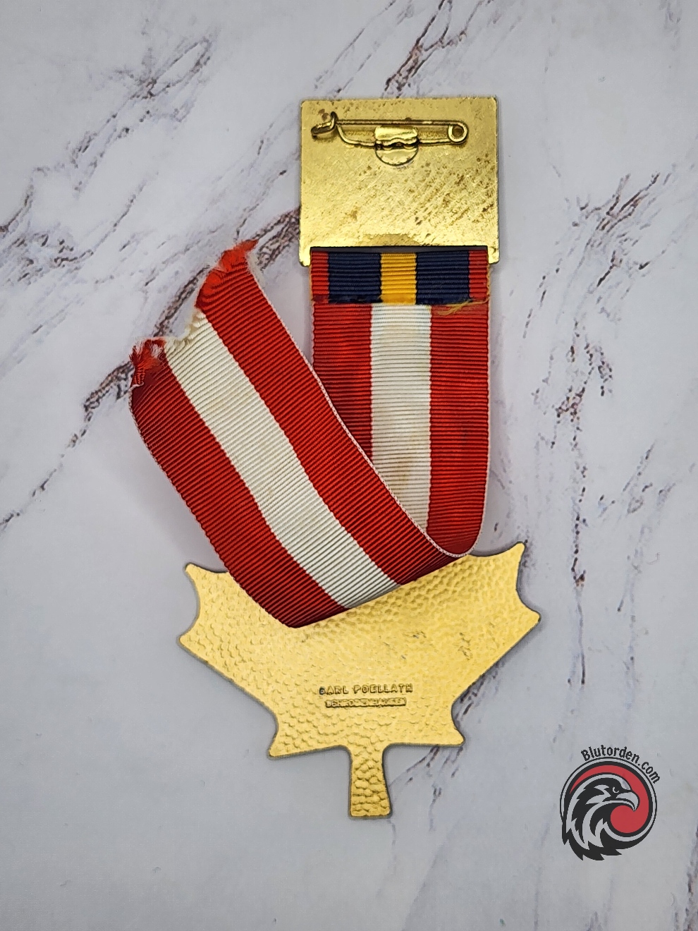 A large red enameled maple leaf pendant with a black battle tank emblem and the inscriptions RCD and LAHR