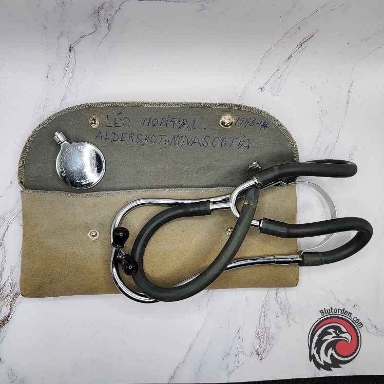 The inside of the pouch bears a handwritten inscription reading “LÉO HOPITAL / ALDERSHOT NOVA SCOTIA / 1943-44,” giving the piece strong wartime Canadian provenance. While no official Canadian military issue markings are visible on the instrument itself, the inscription and family history firmly associate the set with Canadian wartime medical service.