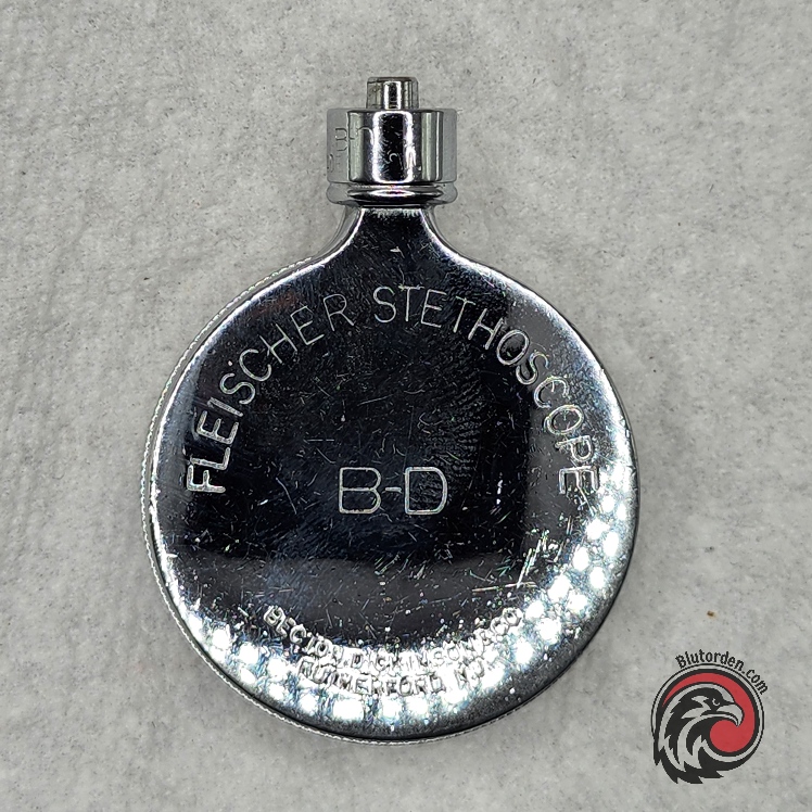 Original Fleischer stethoscope by Becton Dickinson & Co., retained in its period protective pouch. This set comes from the family of a Canadian WWII serviceman who worked as a medical orderly / nurse during the war.