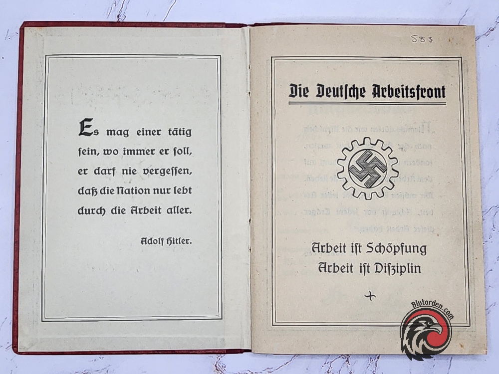 This period booklet retains its original marbled brown cover with gilt DAF emblem (cogwheel and swastika). The interior contains printed introductory pages, including the DAF title page and ideological inscription.