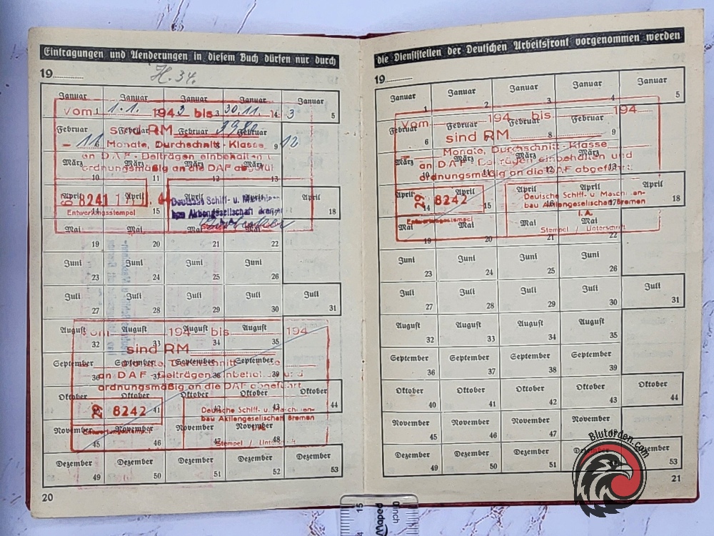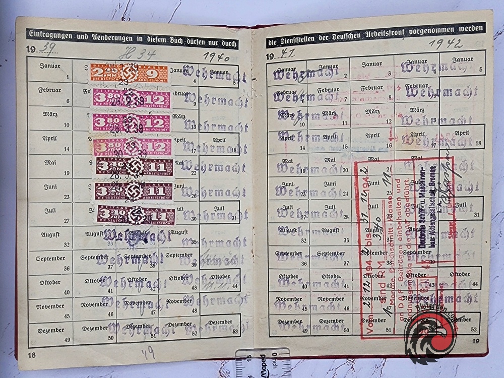 Original Deutsche Arbeitsfront (DAF) membership and contribution booklet, covering the years 1939 through 1942.