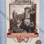 Original WWII-era postcard from Nürnberg, Germany, featuring the historic Burggraben and a dedication to the 1938 Reichsparteitag (Nazi Party Rally). The front showcases a striking black-and-white architectural image with a red decorative border and political insignia of the time.