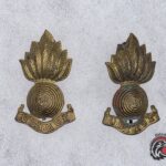 Original pair of British Royal Artillery brass cap badges from World War II. Both feature the iconic flaming grenade design with the word “UBIQUE” on a scroll below, a reference to the regiment’s motto meaning “Everywhere”. These matching badges exhibit age-related wear and patina, especially visible on the reverse, confirming their authenticity and period use.