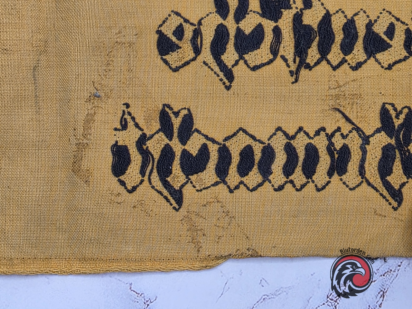 Offered here is an original WWII German “Deutsche Wehrmacht” armband featuring machine-embroidered black Gothic script on a mustard-yellow cloth background. These armbands were issued to personnel affiliated with the Wehrmacht, including auxiliaries, security forces, and other authorized individuals.