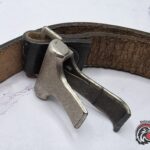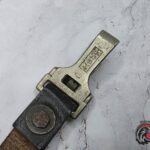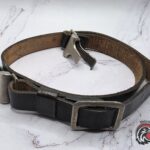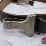 Original World War II Hitler Youth (Hitlerjugend) cross strap, featuring its characteristic black leather construction and aluminum hardware.