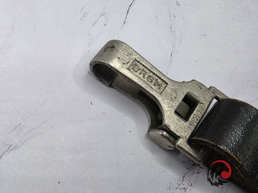 The strap is fitted with a textured aluminum spring hook, clearly marked “DRGM” (Deutsches Reichsgebrauchsmuster), indicating a period German registered design. The hardware retains a nice aged patina, consistent with wartime production.