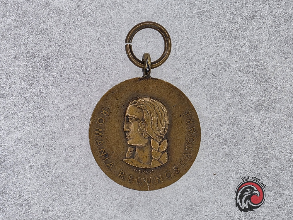 The obverse features a classical female profile symbolizing Romania, encircled by the inscription “ROMANIA RECUNOSCĂTOARE” (“Grateful Romania”).