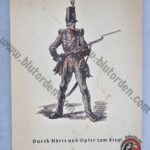 Original WWII Feldpost postcard issued for the Wehrmacht Day of 1943. The front depicts a Prussian infantryman from the Napoleonic Wars (Wars of Liberation, early 19th century) with fixed bayonet, accompanied by the slogan “Durch Härte und Opfer zum Sieg!” (“Through hardness and sacrifice to victory!”). Printed Feldpost usage with handwritten message and clear fieldpost cancellations dated 5 March 1943 (Pocking, Bavaria). A patriotic propaganda issue combining historical military imagery with wartime morale-building.