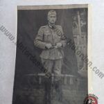 Original period silver-gelatin photograph, approximately 9 × 12 cm. Three-quarter portrait of a Heer enlisted man in side cap and field blouse, standing before a cloth backdrop; a combat badge is visible on the left breast pocket (likely the Infantry Assault Badge). Verso with pencil inscription dated “2.5.1942” and a place note (partially illegible). Condition: light edge/corner wear, mild surface ripple and a small emulsion scuff at right center; slight age toning along the top—no tears. A solid mid-war portrait with visible insignia and a precise date.