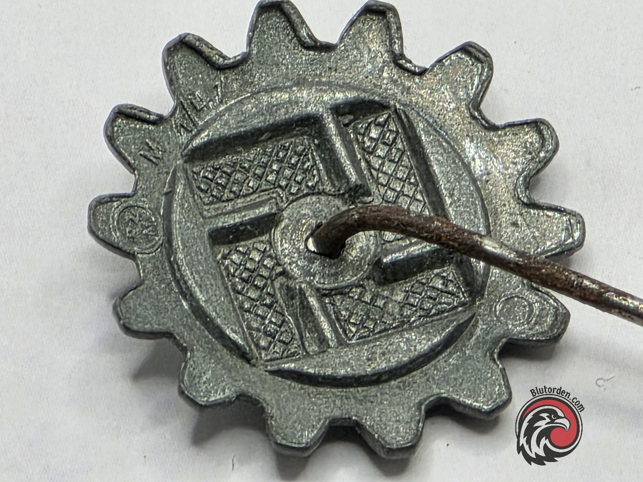 Original DAF (Deutsche Arbeitsfront) gearwheel stickpin featuring the classic cogwheel design with a centrally placed swastika. This example is die-struck in zinc, showing sharp definition in the textured background fields and clean outlines on the gearwheel teeth.