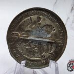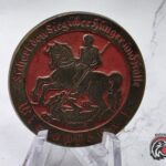 Original 1935 German event tinnie from Hannover featuring a striking mounted knight design slaying a dragon, surrounded by period Gothic script.