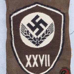 Original RADwJ (Reichsarbeitsdienst der weiblichen Jugend) sleeve badge, representing Group XXVII of the Female Labor Service. This finely woven shield features the national emblem flanked by wheat stalks, a symbol of agricultural labor and service, surrounded by a brown border and white Roman numerals.