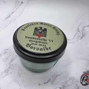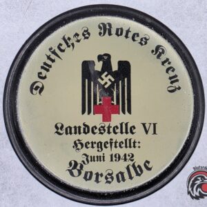 Rare and original WWII-era German Red Cross (Deutsches Rotes Kreuz / DRK) medical ointment jar labeled “Borsalbe”, dated June 1942. This type of jar contained a topical salve—likely used for treating wounds, burns, or skin conditions—distributed by the Landestelle VI, a regional medical supply branch.